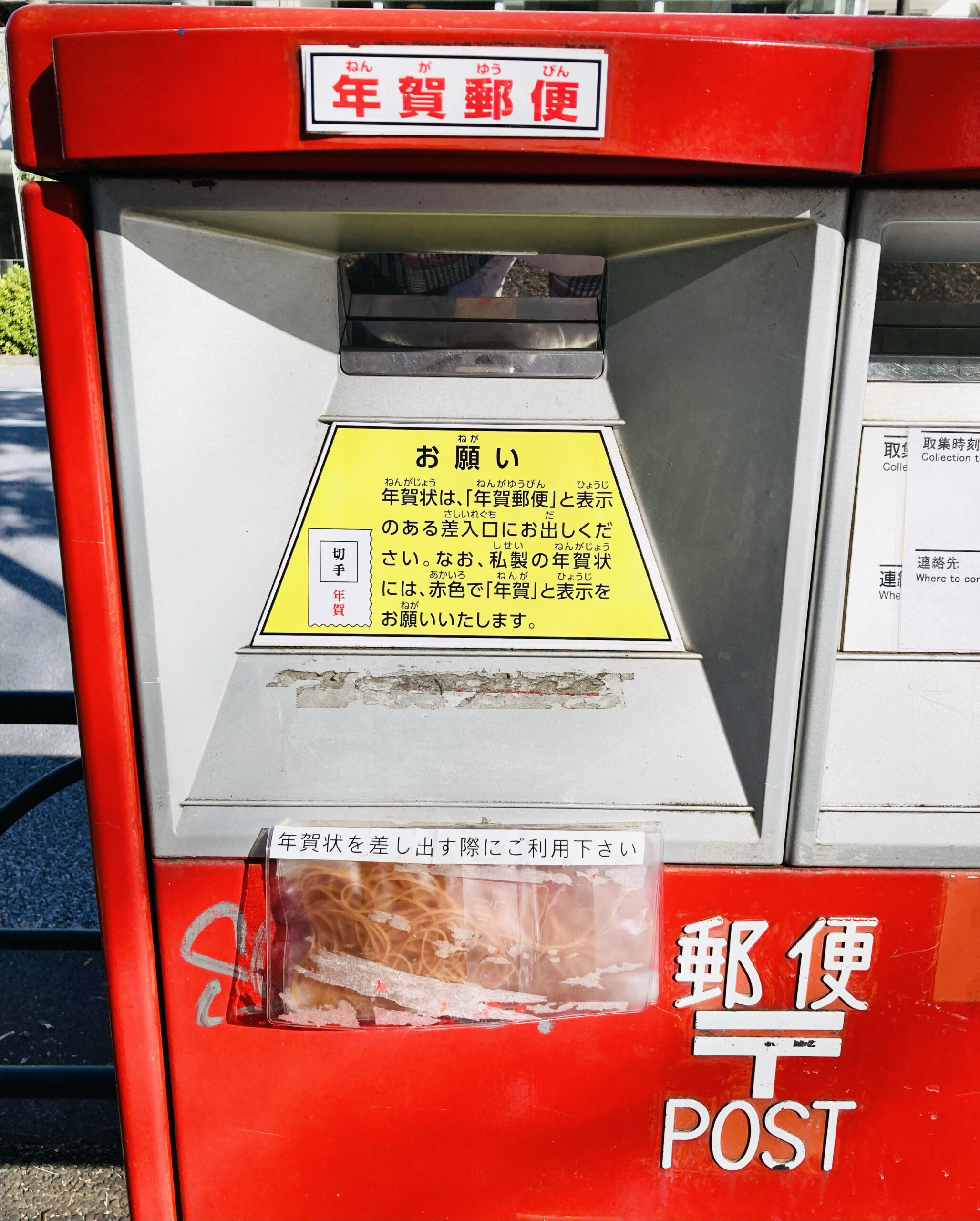 目次 1 年賀状投函用の輪ゴムサービス 年賀状投函用の輪ゴムサービス 近所のポスト何個かあるのですが全部輪ゴムサービスが付いてました。郵便物の仕分け仕事やっている人に聞いたら大量のハガキは輪ゴムで止めてもらえると仕分けで助かるそうです。数枚ならなくてもいいそうです。 この季節、2箇所投函タイプのポストの場合、一方が年賀状専用になりますよね。そこの下記のように輪ゴムサービスが付いているのですよ。 最 … 続きを読む 年賀状投函用の輪ゴムサービス