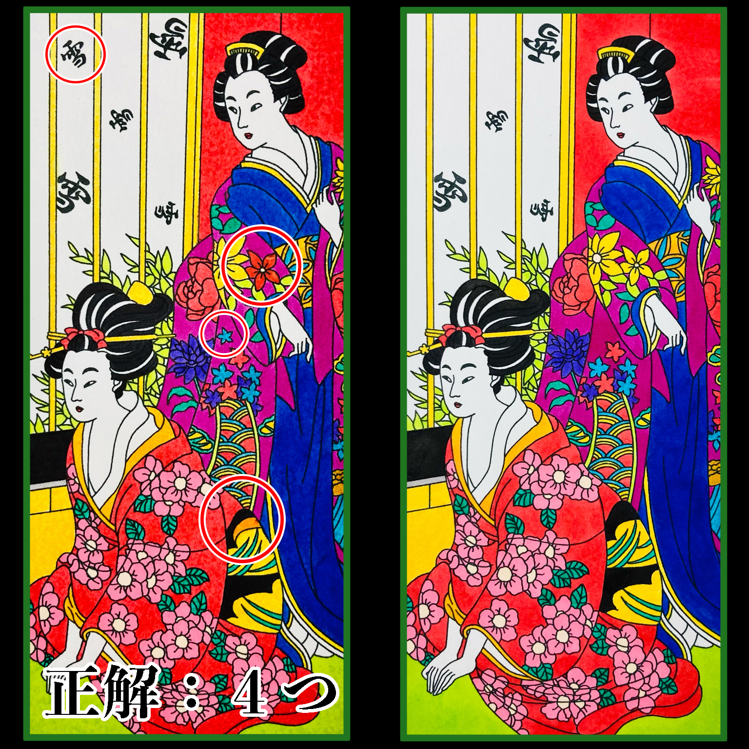 目次 1 お正月まちがいさがし絵の正解発表 お正月まちがいさがし絵の正解発表 お正月に投稿したこちらのまちがいさがしにご参加いただいた方ありがとうございました。 ちなみにこんなまちがいさがし絵です。昔描いた浮世絵風まちがいさがしイラストです。 まちがいの場所と個数はこちらです。 いかがでしたでしょうか。まちがいさがしお楽しみいただけたら幸いです。(^o^)/